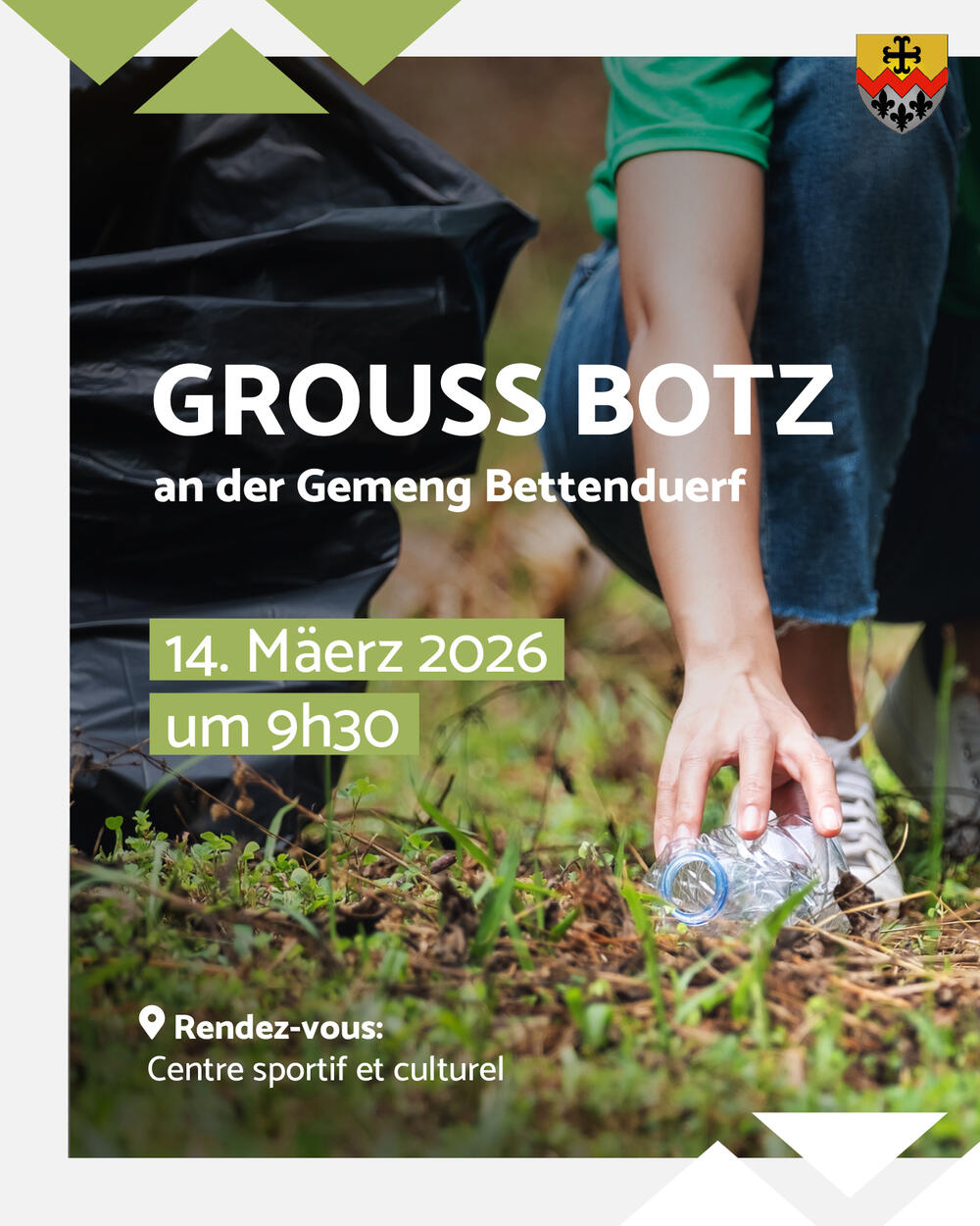 D’Gemeng Bettenduerf, zesumme mat der Ëmweltkommissioun, invitéieren Iech alleguer op d'Grouss Botz, Samschdes, de 14. Mäerz 2026 um 9:30 virun der Sportshal zu Bettenduerf. D'Participatioun bei der Grousser Botz ënnerstëtzt net just d'Ëmwelt, mä bitt och déi ideal Geleeënheet mat de Kanner d'Thema Natur an Offall ze behandelen. Hëlleft eis d’Gemeng propper ze halen!